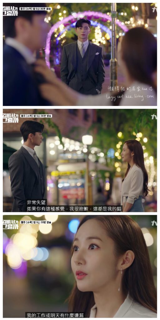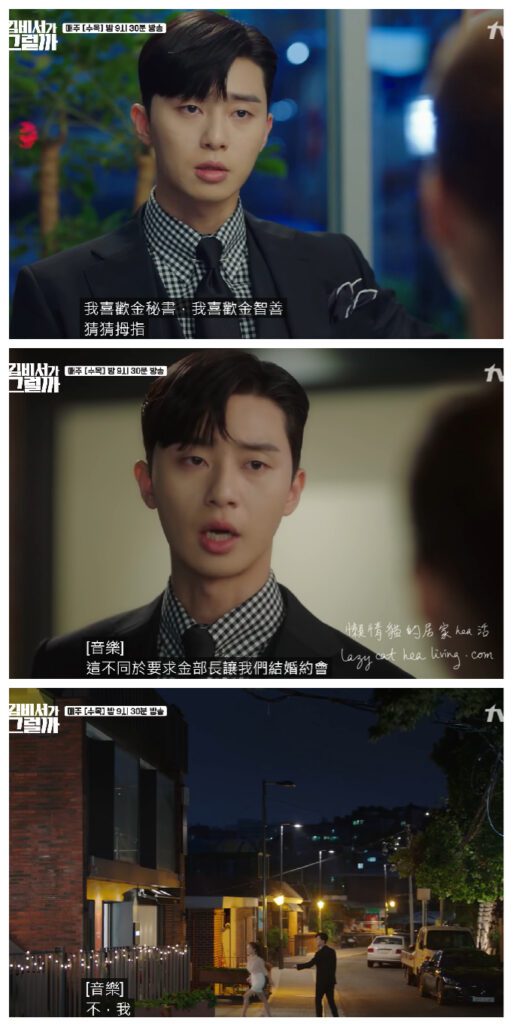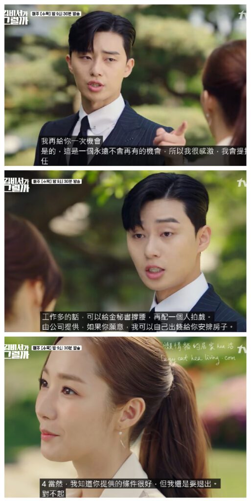 第一集微笑(金秘書)已提出請辭。起初英俊還要裝作一臉沒所謂, 回家後才發現這大件事了, 晚上睡也睡不好。
