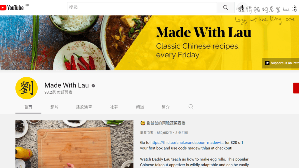 今天懶惰貓想介紹一個Youtube 教烹飪的頻道給大家, 是一個美國華人教做中菜的頻道, 叫「Made with Lau」。雖然影片中有部份時間是講英文的, 但是影片中有清晰的示範, 而且每道菜看起來也跟香港平常吃到的蠻像的, 個人認為非常適合新手參考。