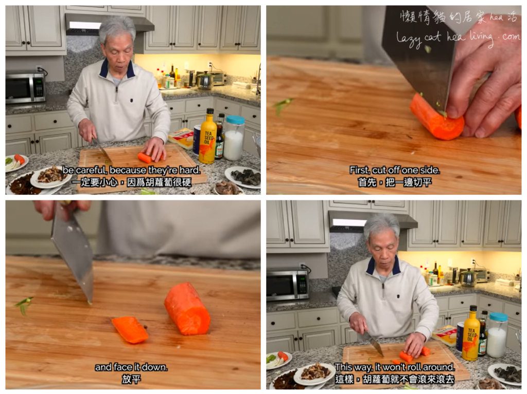 劉爸做菜, 也會教授一些很有用的入廚技巧。例如他會講講如何把紅蘿蔔切絲和如何處理豬排等。