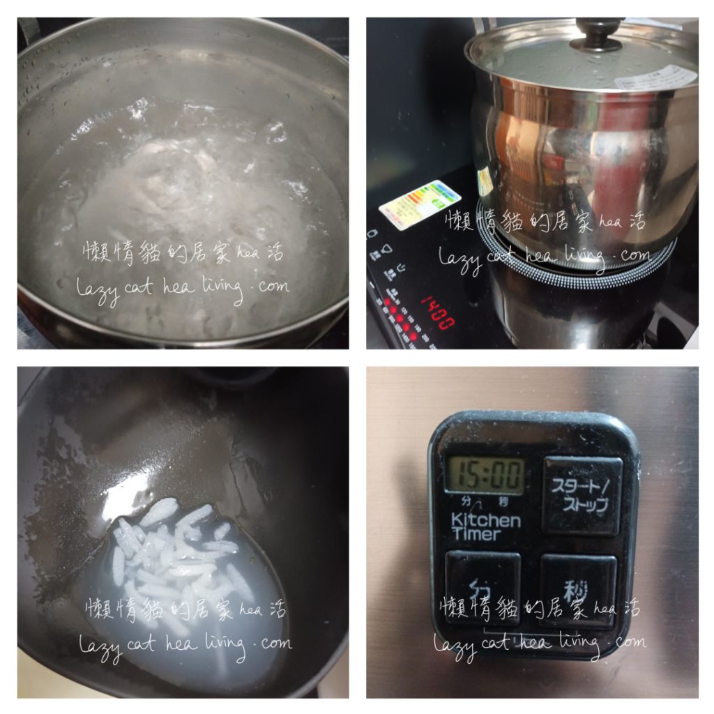 - 米洗淨, 把水倒進真空煲內鍋, 煮至水滾後把米、油、鹽加進去, 蓋上鍋蓋, 中火煮 15 分鐘。