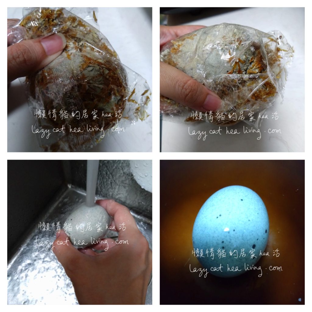 然後拆開塑膠袋, 就把裡面的的皮蛋取出, 塑膠袋連同裡面的髒東西就可以丟了。把皮蛋放在水下洗乾淨蛋殼即可。