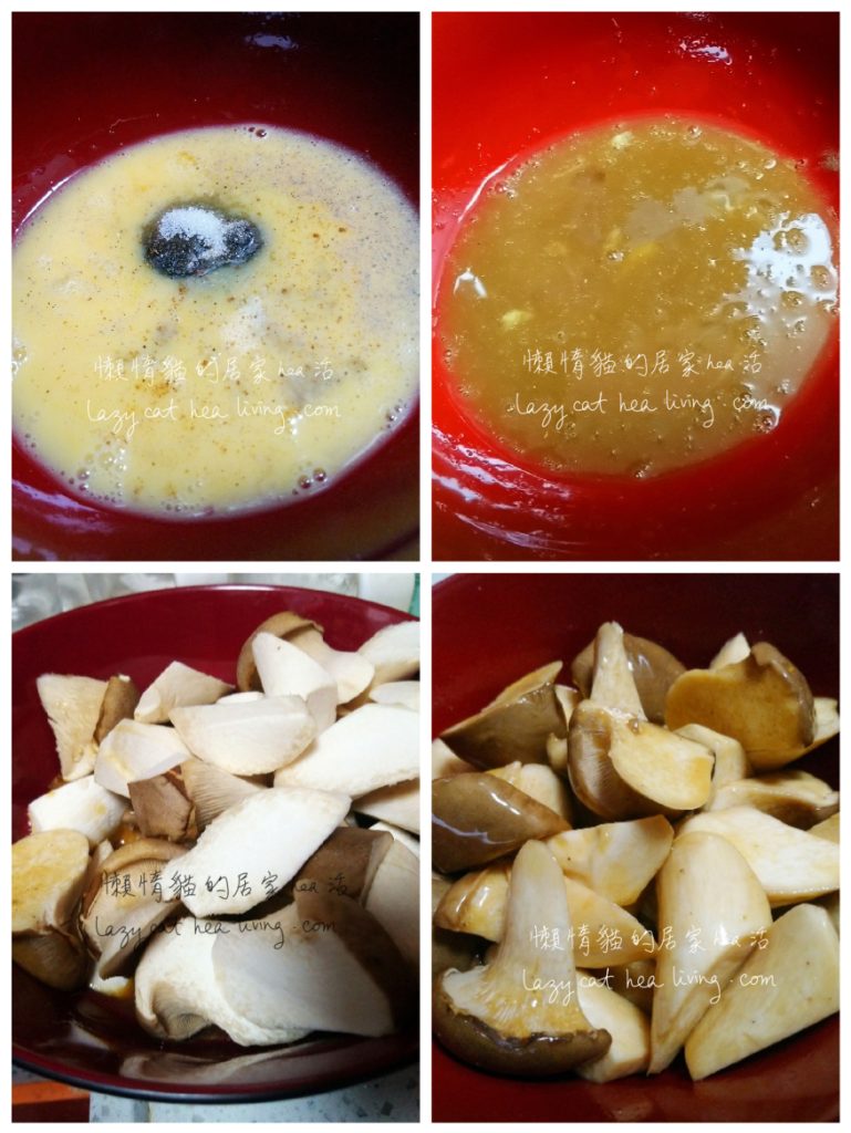 - 雞蛋打散, 加入雞蛋調味料攪勻, 然後加入杏鮑菇徹底拌勻, 使每一塊杏鮑菇都可以沾上蛋液。