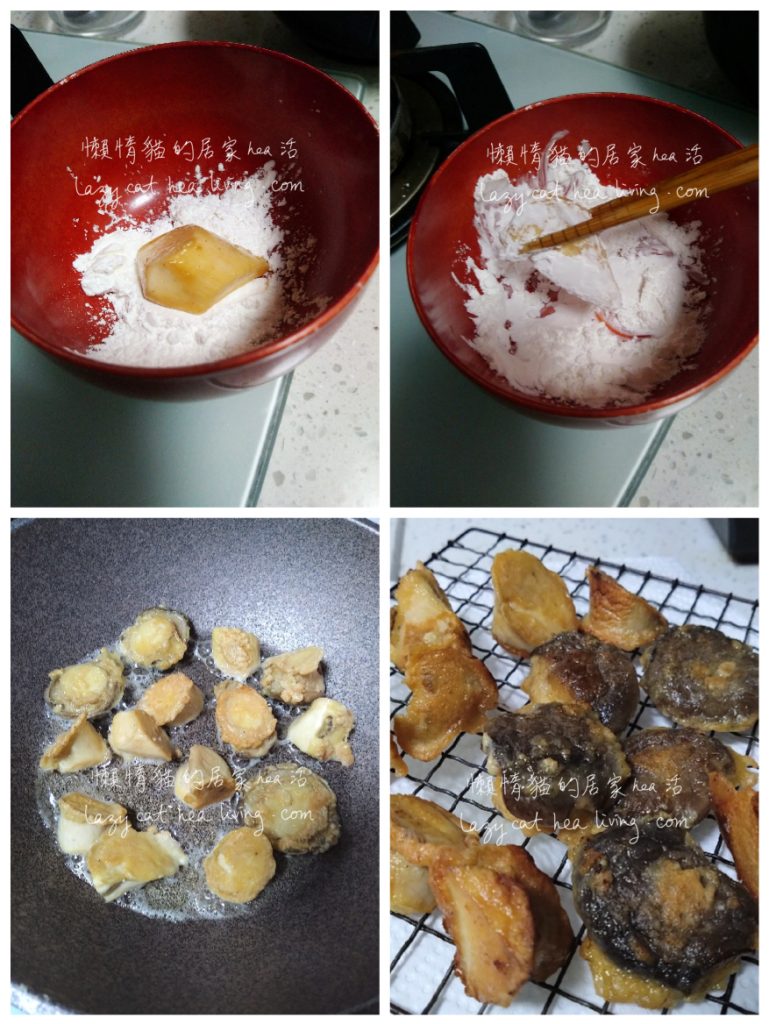 - 油熱了以後, 把杏鮑菇逐一沾上生粉後下鍋。(如果鍋子空間不夠, 可以分成兩三次去煎。)