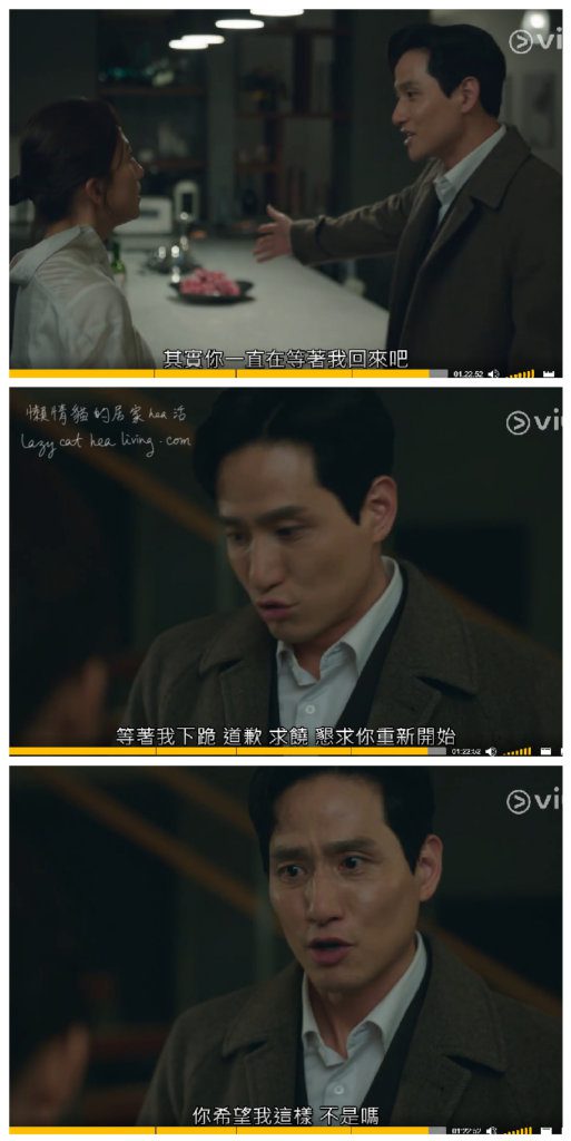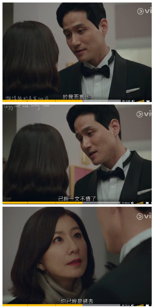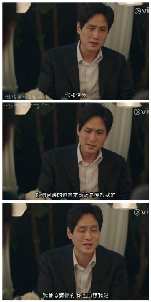 這樣的渣男, 難怪連兒子都忍不住罵回去先離開現場! 幸好之後善雨還是理性的堅拒復合, 總算讓我心理平衡了。