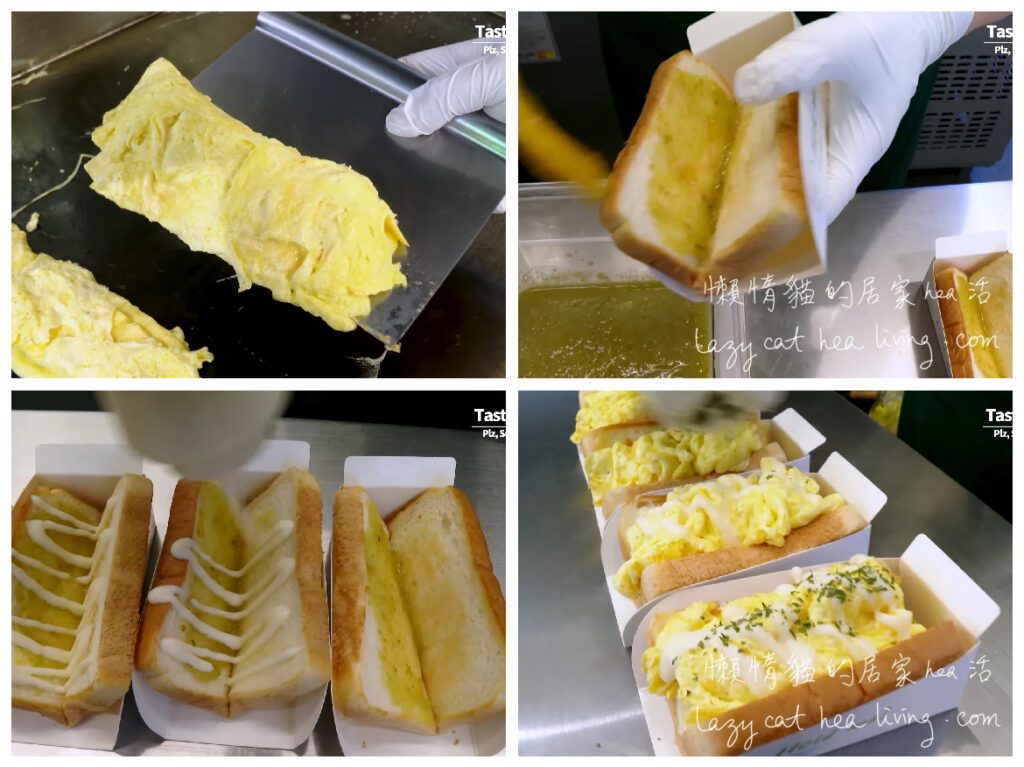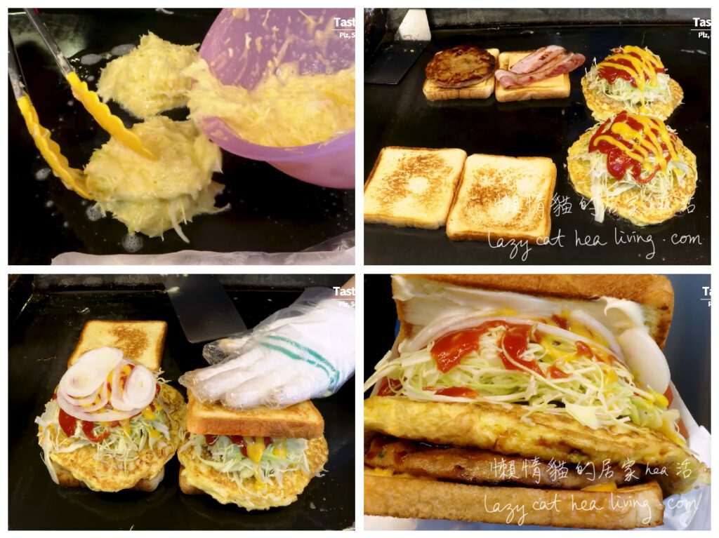 上面每款都好像很好吃啊, 煎得香酥的麵包、多款惹味醬汁、堆得跟山一樣的椰菜絲、厚厚的雞蛋…… 韓式三文治的用料真是超豐富的。
