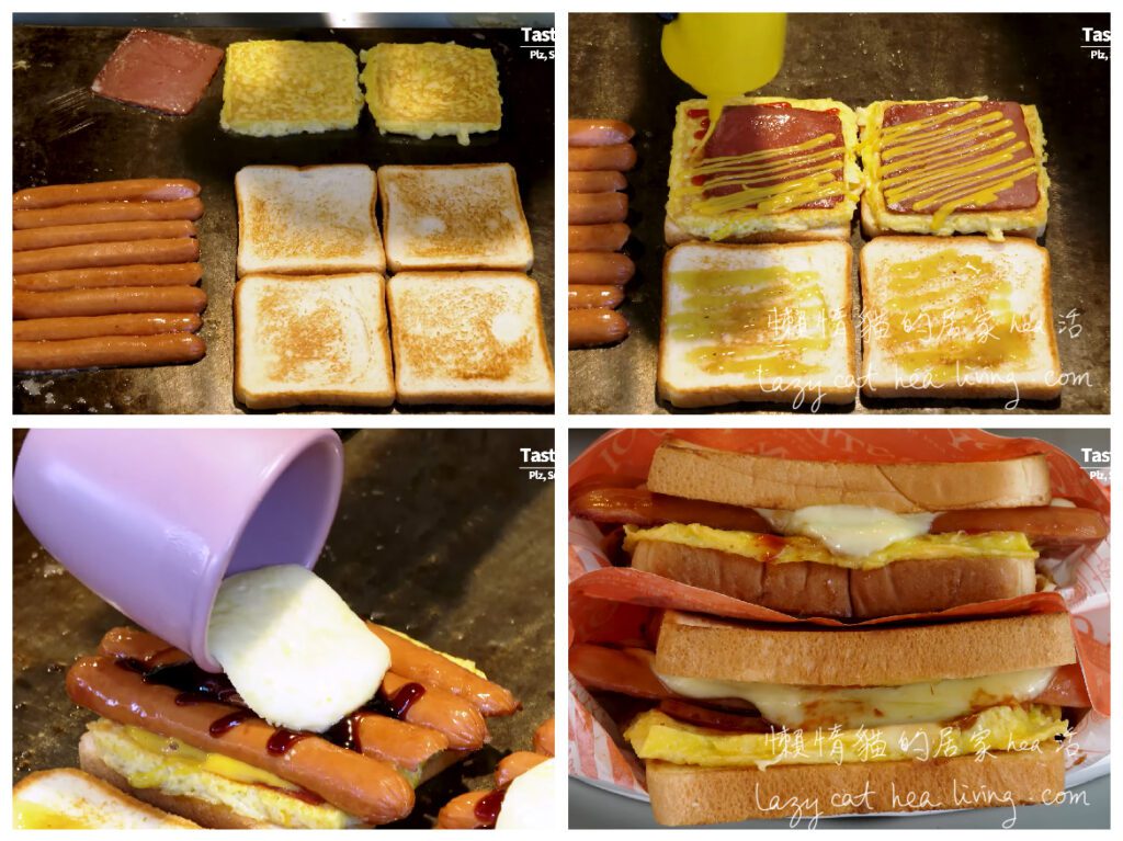 嫌這些太普通嗎? 夾香腸的三文治你又吃過嗎? 下面這家店的三文治夾了兩根香腸, 至少淋上四款醬料, 除了煎蛋, 上面還再加上一顆蛋。看, 香腸都凸出來了!