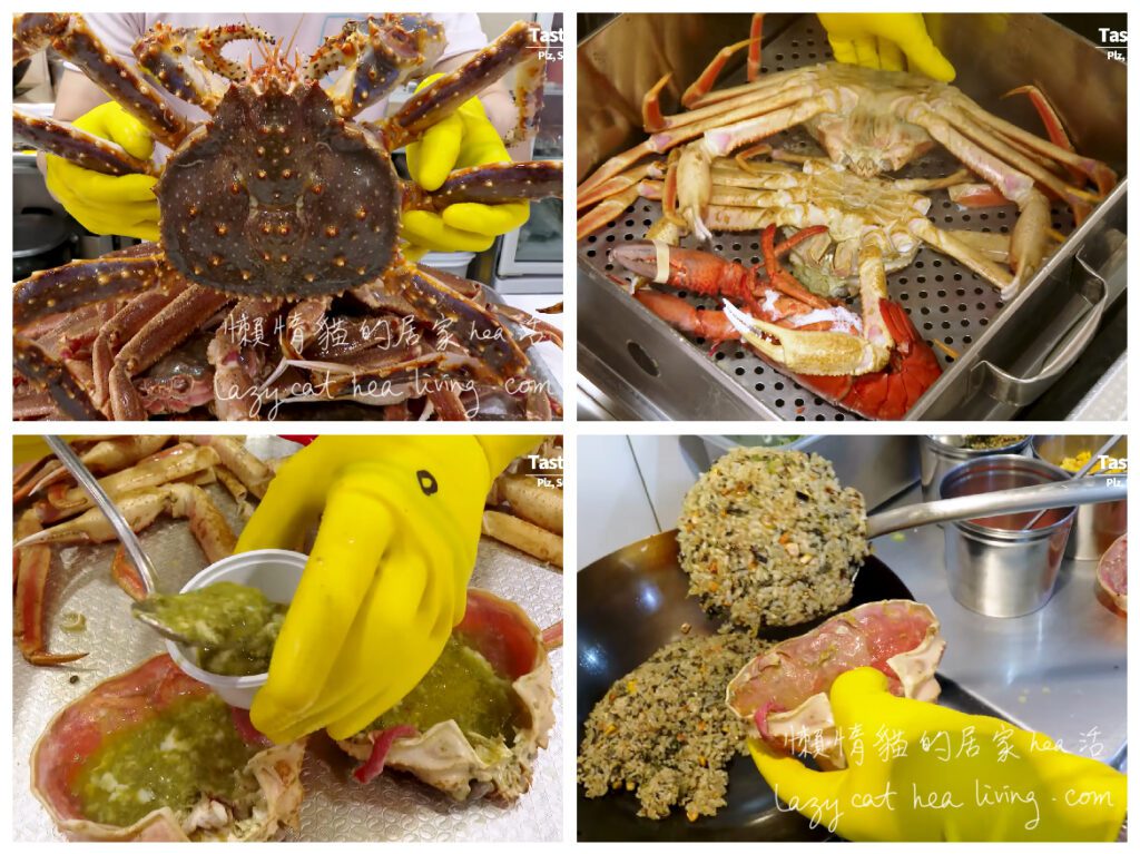 套餐包括兩隻很大很大隻的帝王蟹和一隻龍蝦。清蒸以後, 蟹蓋的蟹膏會留著, 然後會把炒飯釀在蟹蓋。