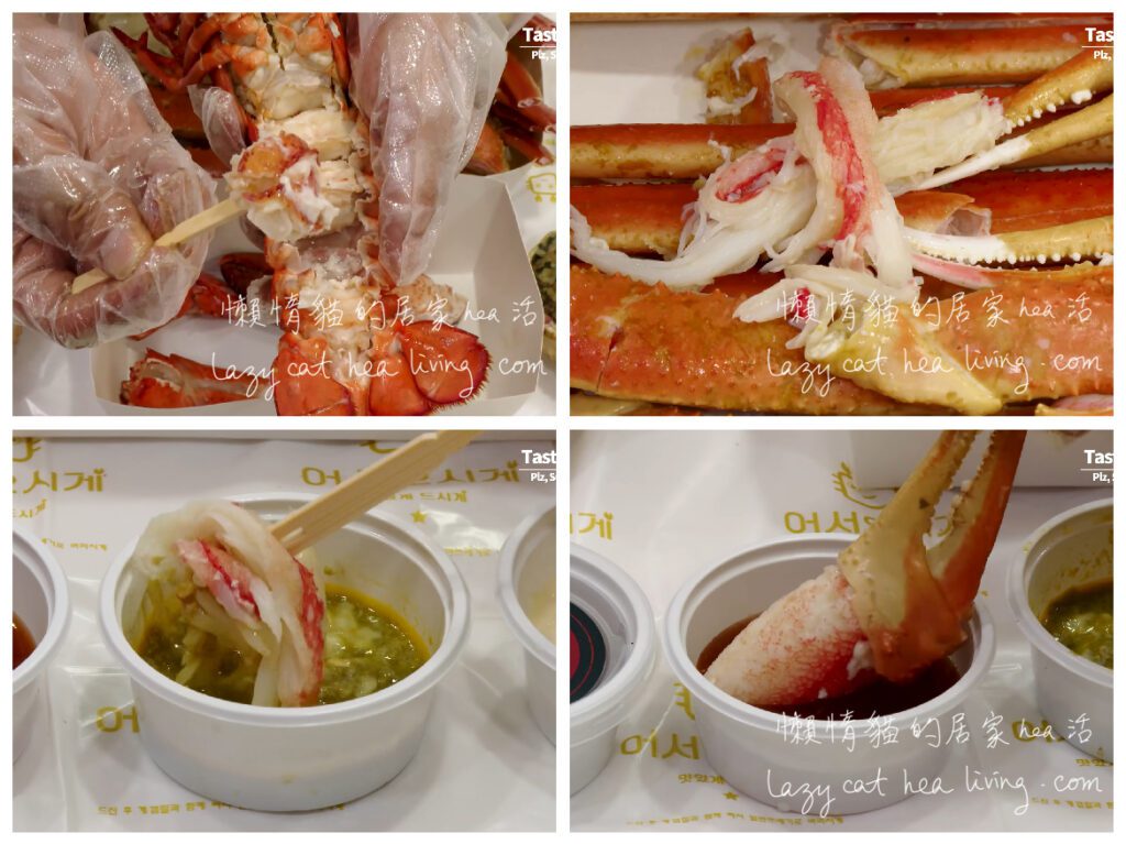 最後還試吃呢, 新鮮蒸好的蟹肉沾著不同的沾醬, 一定很好吃呢!