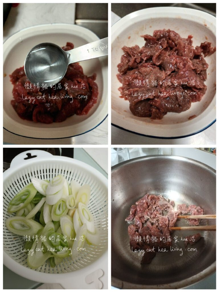 牛肉片的部份, 最怕是很硬很難咬, 重點就是要逆紋切, 然後從醃料中入手。從前我也是下一點梳打粉去軟化肉質的, 後來我發現了台灣的「寶寶師」邱寶郎師傅的教學影片, 說其實加水去醃牛肉就可以了。