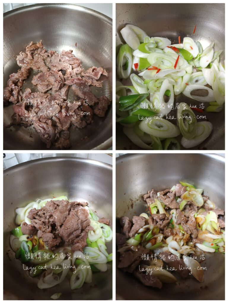 主角就是牛肉和京蔥, 然後我也加了半隻辣椒去配色(可以省略), 真的就只有這三種材料而已, 別的蔥薑蒜都沒有放。