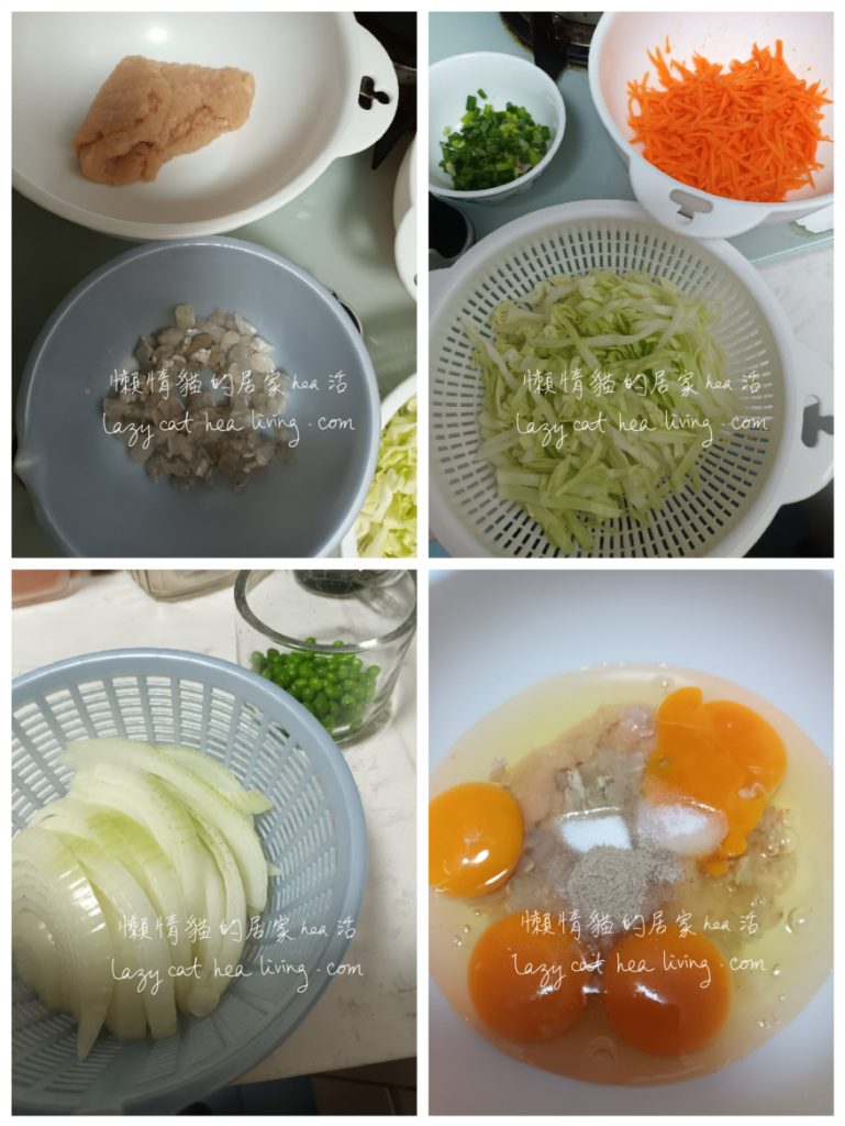 - 甘筍去皮後洗淨, 刨成絲。椰菜洗淨切絲。蔥洗淨切粒。洋蔥去皮後洗淨, 切絲。青豆解凍後洗淨。