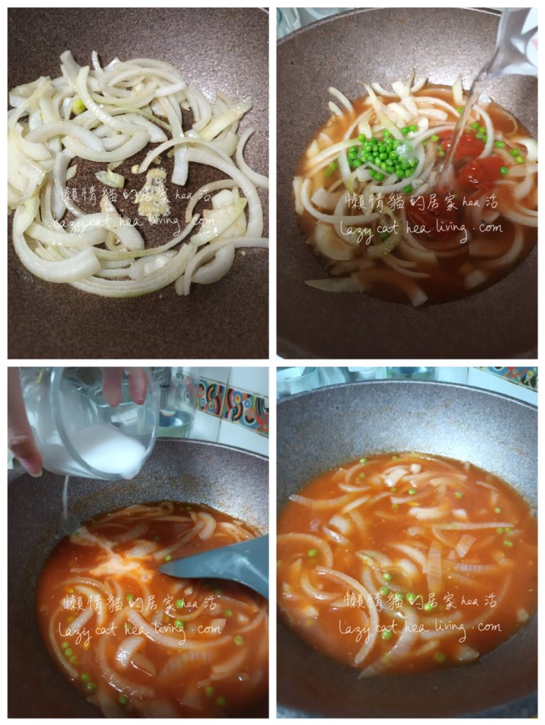 - 不用洗鍋, 直接把洋蔥倒進去, 中火炒香, 然後加入蒜茸(如有) 一同炒香。