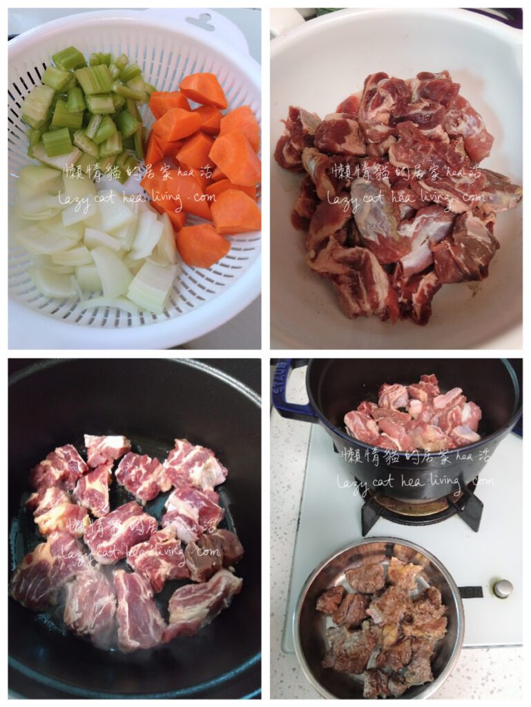 - 牛肋條解凍後, 洗淨, 以廚紙吸乾水份, 切塊。(不要切太小顆, 燜煮後還會縮小呢。)