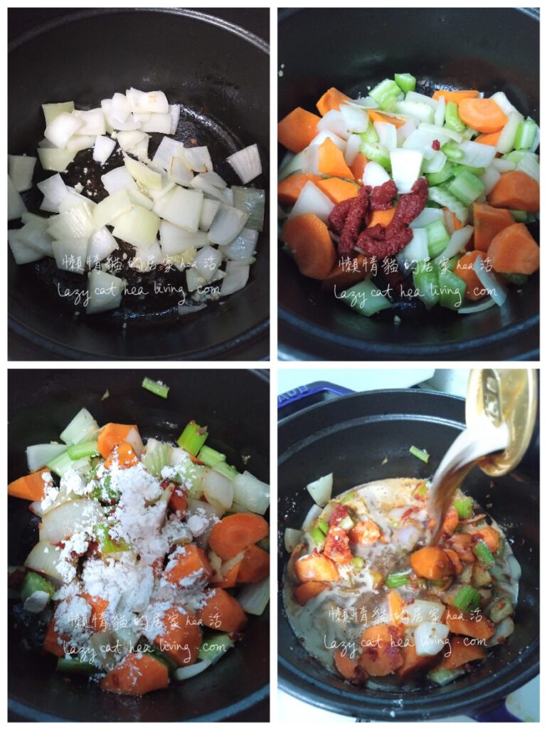 - 加入西芹、甘筍、蕃茄膏炒勻後, 加入麵粉再炒勻。