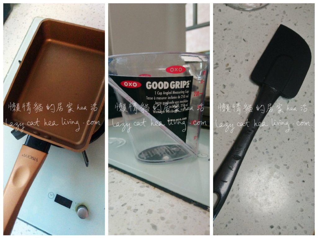 正如我上面所說, 我建議新手可以買一個易潔(不沾)的玉子燒鍋, 和一個量杯。