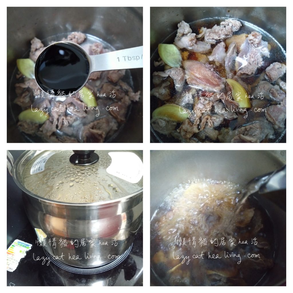 - 把步驟 3 的牛筋、薑片、調味料都倒進鍋子裡, 水的高度需要淹過牛筋多一些, 大火煮滾。