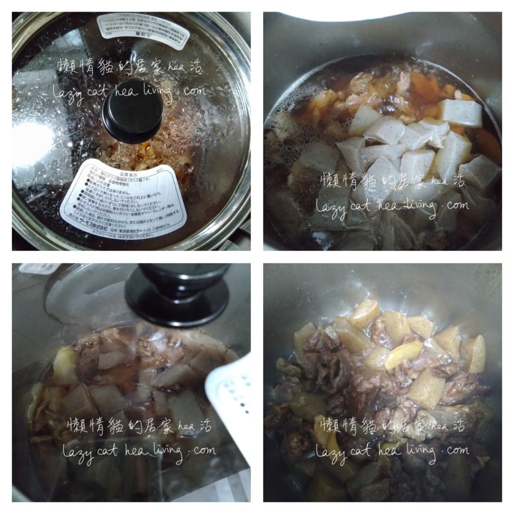 - 加入步驟 2 的蒟蒻拌勻, 蓋上鍋蓋大火煮滾, 轉小火燜煮 30 分鐘。(*這步驟我也是使用真空鍋真空燜煮。)
