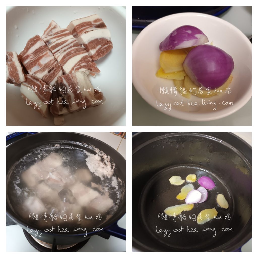- 羊腩解凍, 煮滾一鍋水, 裡面加 2 片薑片, 把羊腩放進去煮 5 分鐘以後, 撈起備用。