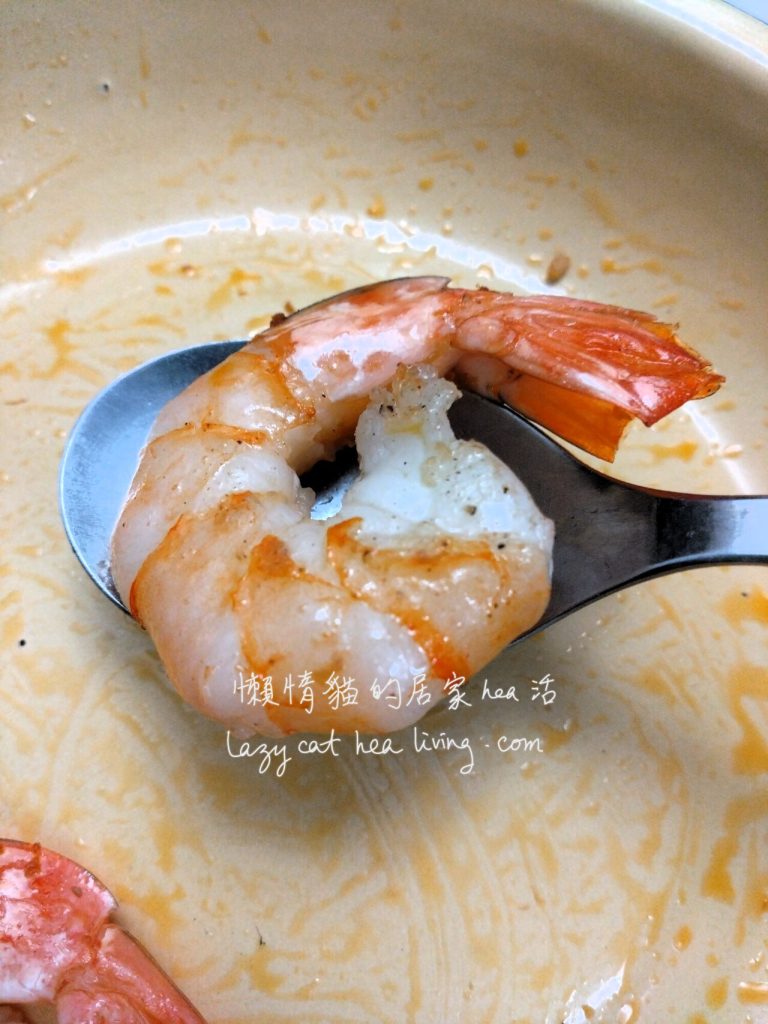 - 鍋子不用洗, 把大蝦下鍋, 中火煎至兩面都熟透, 盛起大蝦備用。