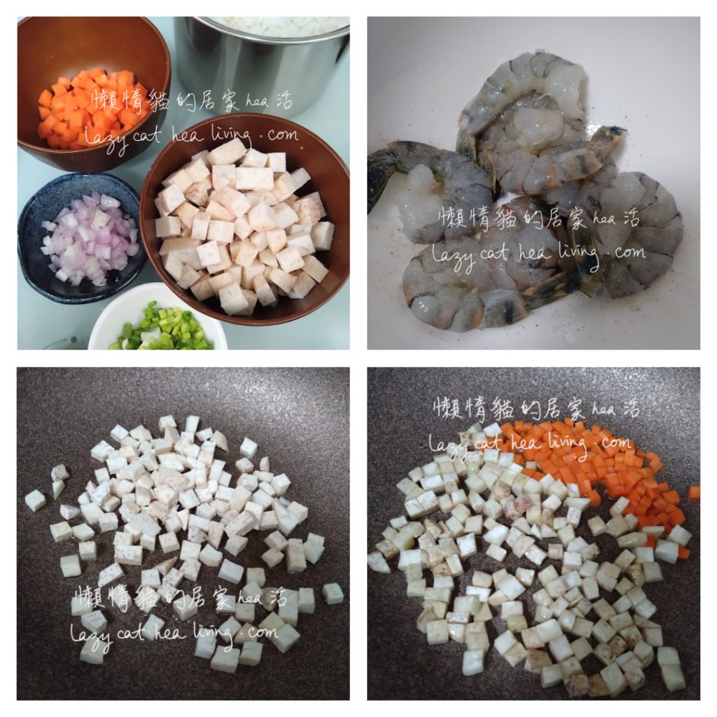 - 芋頭和甘筍去皮洗淨, 然後切小丁。(盡量切得小一點)