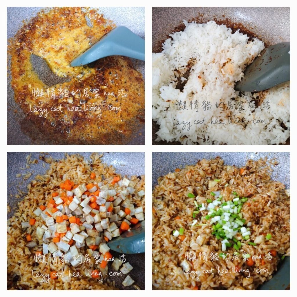 - 白飯下鍋一起炒, 炒至飯粒散開, 顏色均勻以後, 加入步驟 3 的芋頭和甘筍炒勻。