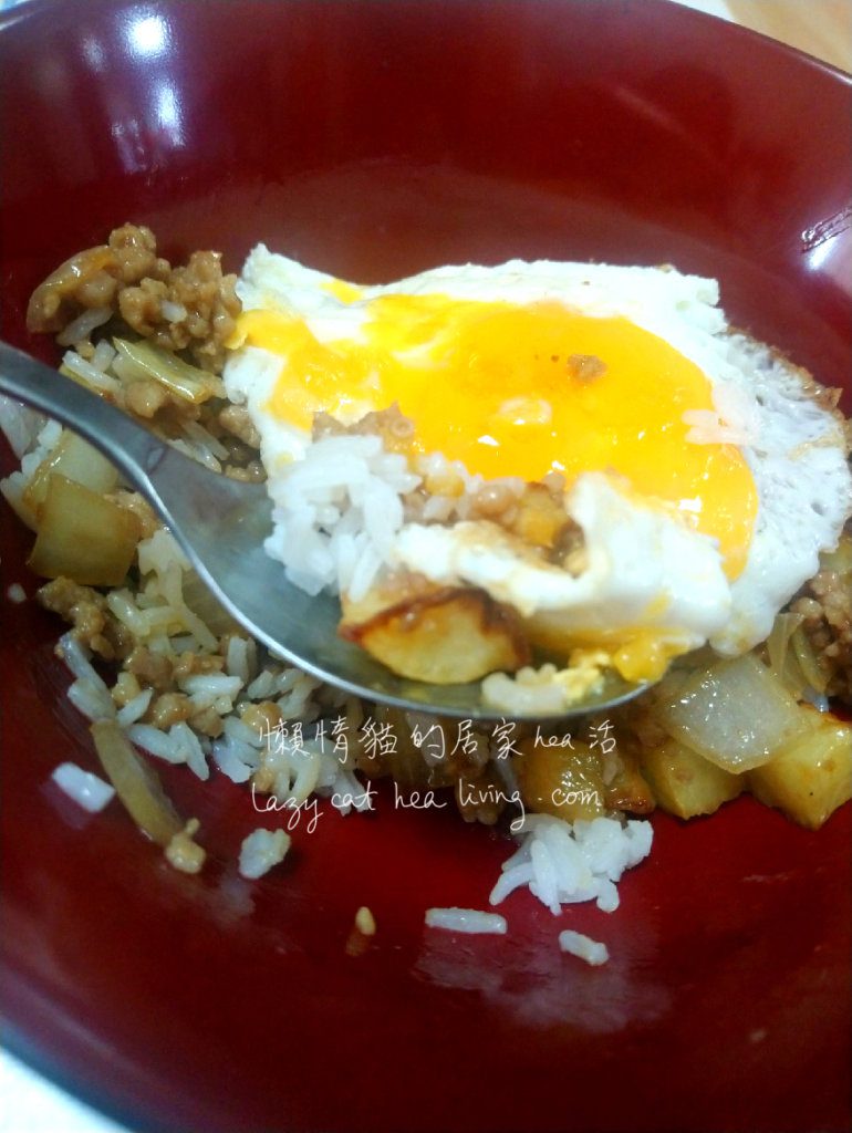 吃飯嘍! 一匙同時把煎蛋、炒香的肉末、洋蔥、薯仔和白飯放進口中, 非常滿足。^^
