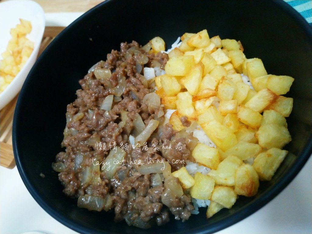 6. 白飯分裝到盤子或碗子, 把炒免治淋在白飯上。
