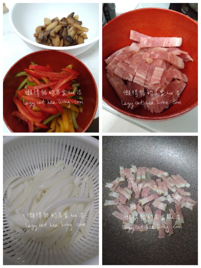- 煙肉解凍後切條。洋蔥去皮洗淨切絲, 迷你彩椒洗淨去蒂去籽後切絲。