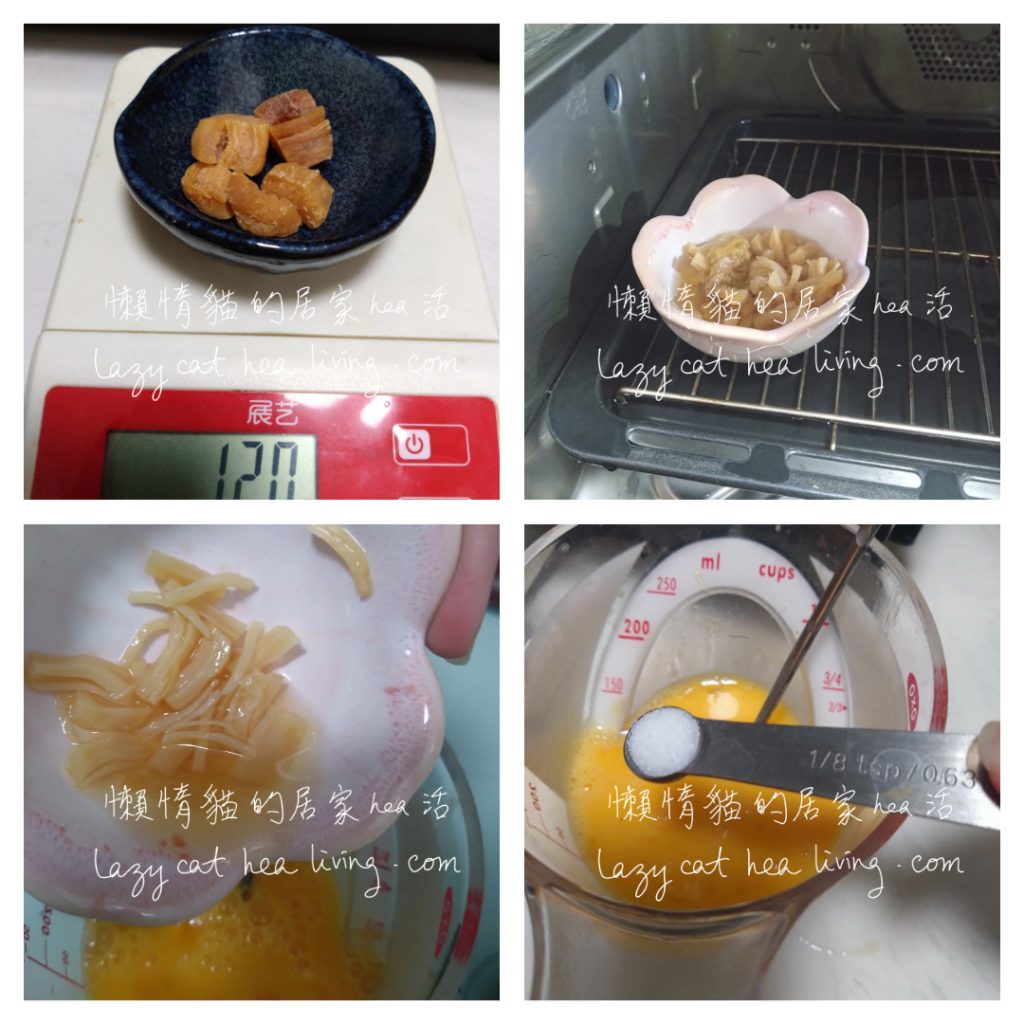 - 瑤柱先浸軟, 連同浸泡的水, 先蒸 10 分鐘(如果怕腥味, 上面可放一片薑), 放涼備用。