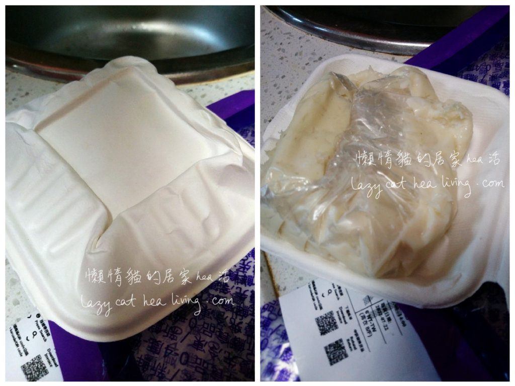 它從前是直接以兩層塑膠袋包裝的, 最近幾次改成塑膠袋裡包了紙盒, 紙盒裡又有一層塑膠膜包裝。雖然每次收貨時紙盒都已經壓扁了, 但不要緊, 裡面的墨魚滑還是好好的。