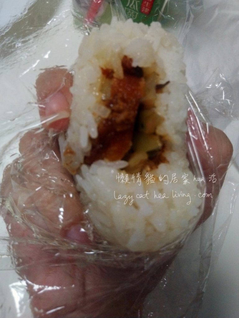 - 米飯的中間鋪上罐頭香菇肉燥(***小心瀝去油份才鋪到米飯上, 否則油太多, 飯團很容易散開)、冬菇絲、即食榨菜木耳絲、油條和肉鬆。饀料盡量鋪在米飯較正中的位置, 留空米飯較上面和下面的位置可以黏在一起。