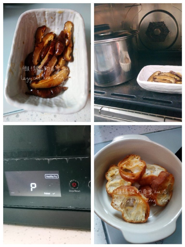 - 油條放在一個烤盤或可以烤的器皿內。焗爐預熱至攝氏230度。(我使用的是panasonic蒸焗爐, 附有「健康炸」模式。)