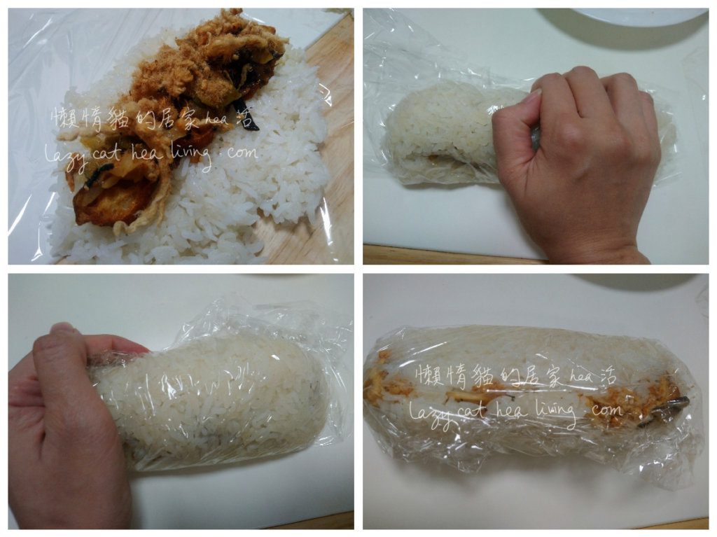 - 把米飯一氣呵成捲成一卷, 隔著保鮮紙分別把米飯的接口和兩旁捏著, 把飯團緊緊握成長條狀。完成!