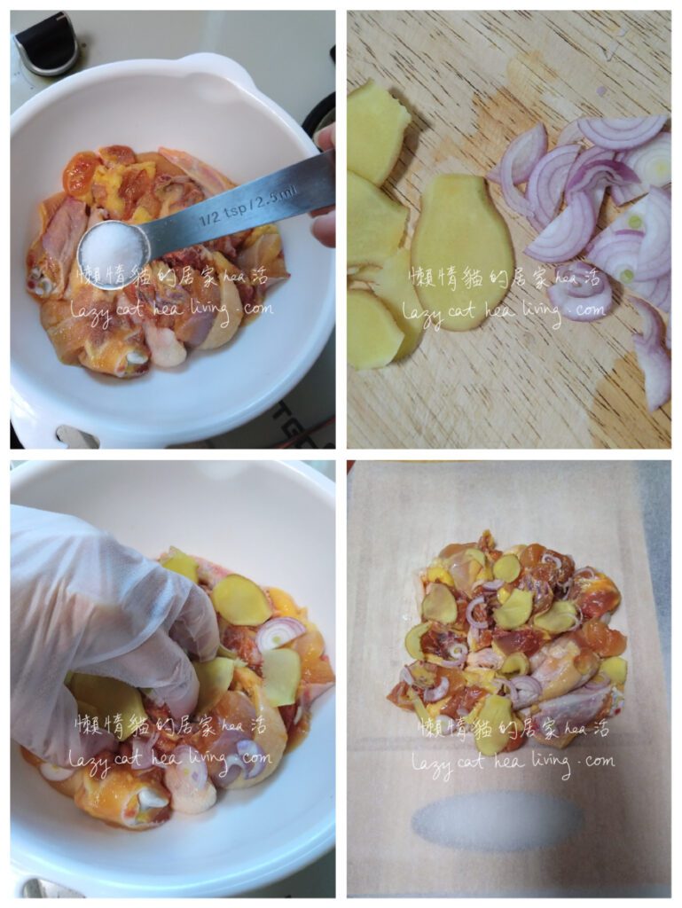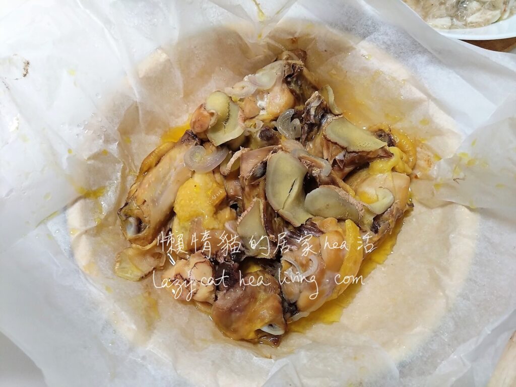 早前懶惰貓看了一本書, 是以客家菜為主題的食譜, 裡面的客家鹹雞是把醃好的雞以烘焙紙包好, 然後放在鍋內直接加熱, 我覺得這個方法蠻特別的。因此今天我參考了這個方法來做做看。