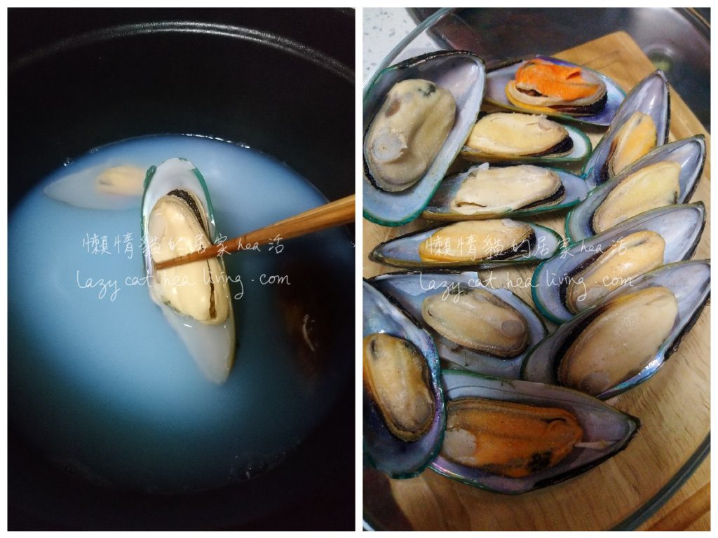 - 青口洗淨, 先煮一鍋水, 水滾後把青口煮 1 – 2 分鐘。