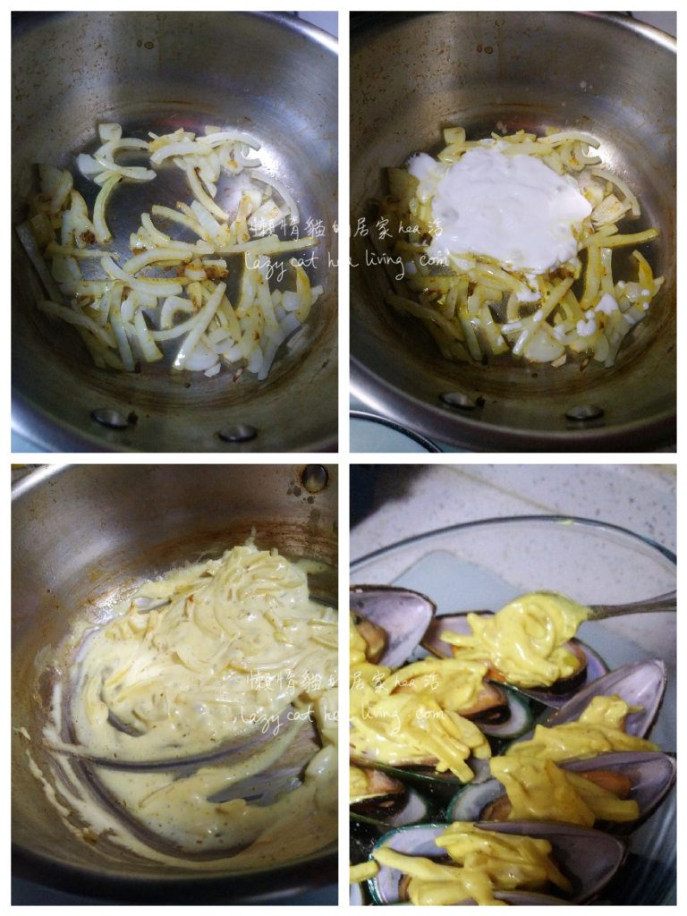 懶惰貓最近在hktvmall 買到很大隻的急凍青口(淡菜), 真的很大隻喔。由於它們太大隻, 而且是急凍的, 所以我決定做一個簡單的醬汁, 然後把它們放進焗爐(烤箱)烤一烤, 做成葡汁焗青口。這道菜的「葡汁」是港式的, 就是混合了很多椰漿和小量的咖哩醬做的啊, 所以才呈現出像螢光黃色的顏色, 不必擔心是否色素下太多很不天然啊。XD