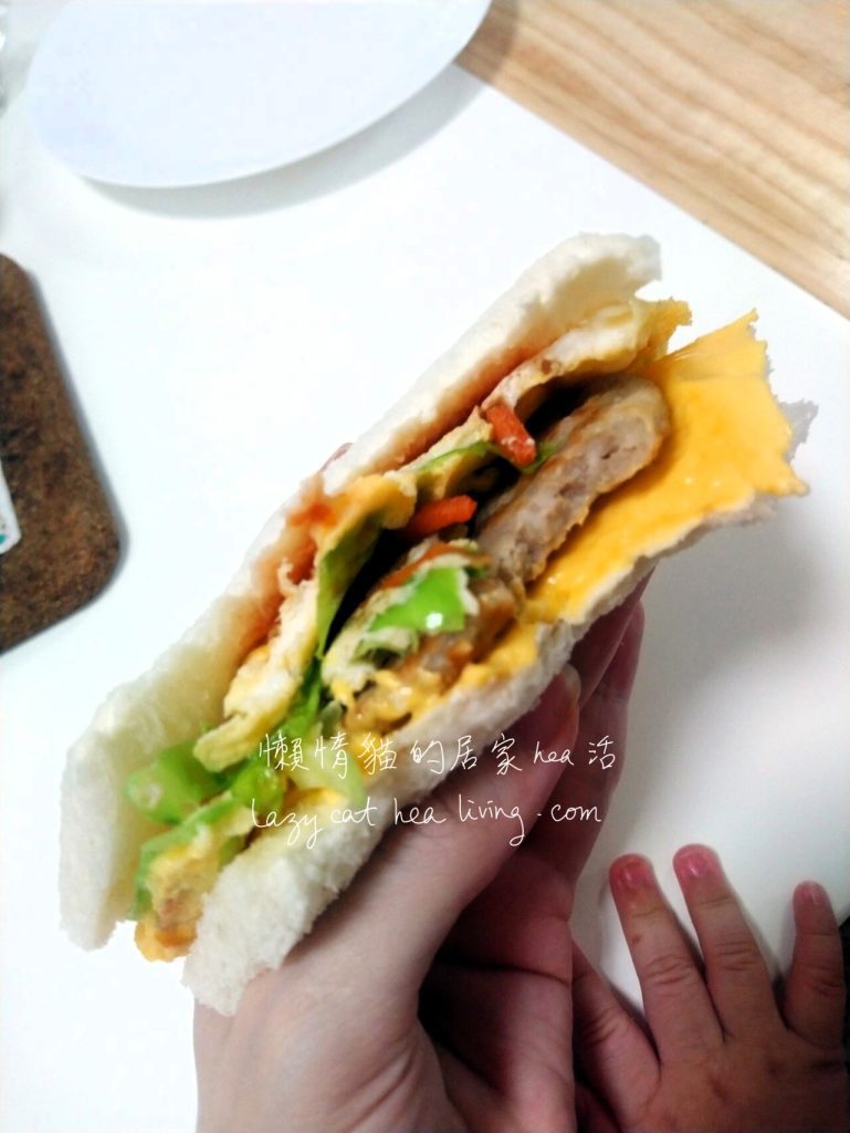 - 在其中三片方包上面, 分別刷上蕃茄醬和芥末, 然後放上蔬菜煎蛋、漢堡豬柳和芝士各一, 再分別蓋上方包。完成!