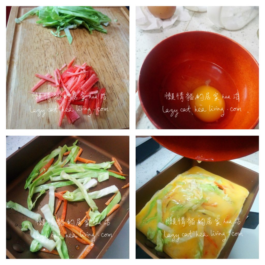- 把雞蛋液和蔬菜分成三份, 重覆下面步驟, 分別煎成三塊蔬菜煎蛋。