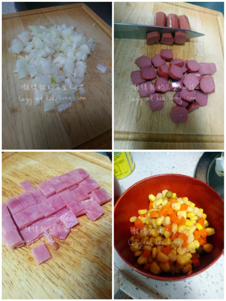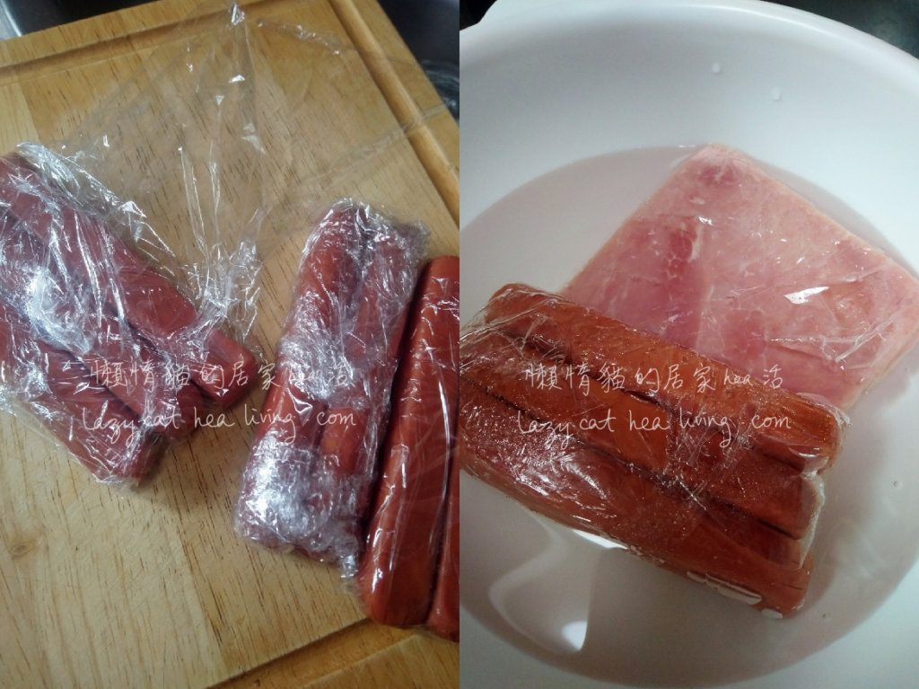 - 香腸、火腿解凍。香腸切片, 火腿切小粒。