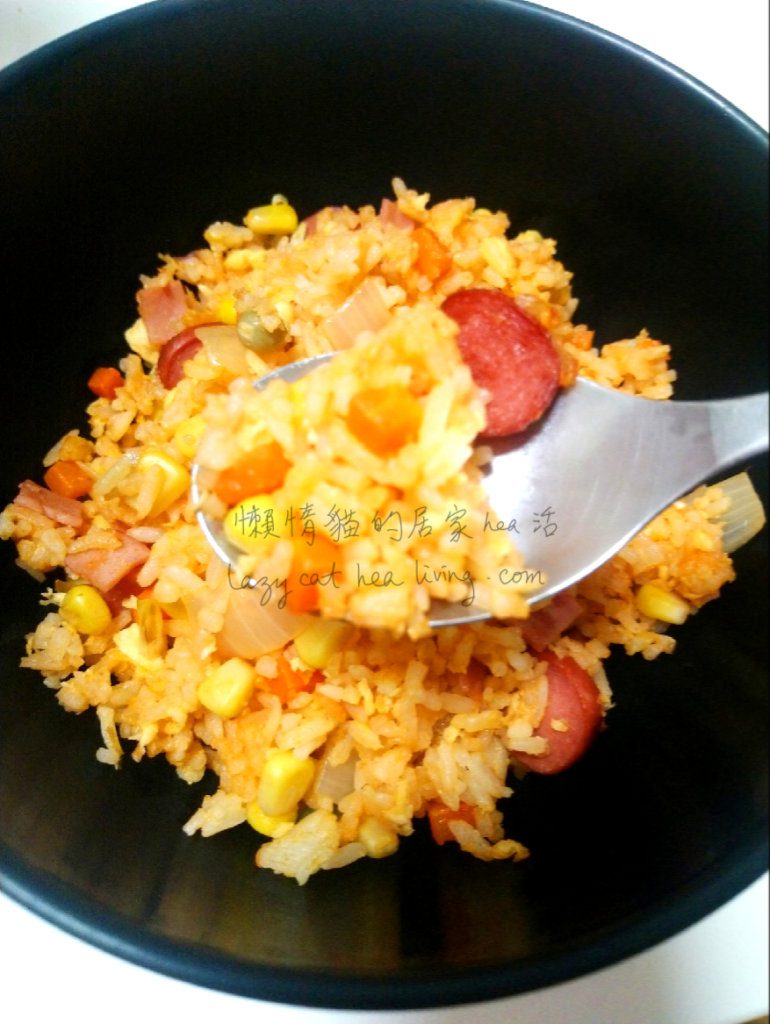 蕃茄醬酸酸甜甜, 配上香腸、火腿、三色豆和洋蔥吃, 既對味又開胃, 偶然也吃得到蛋炒飯的香氣。