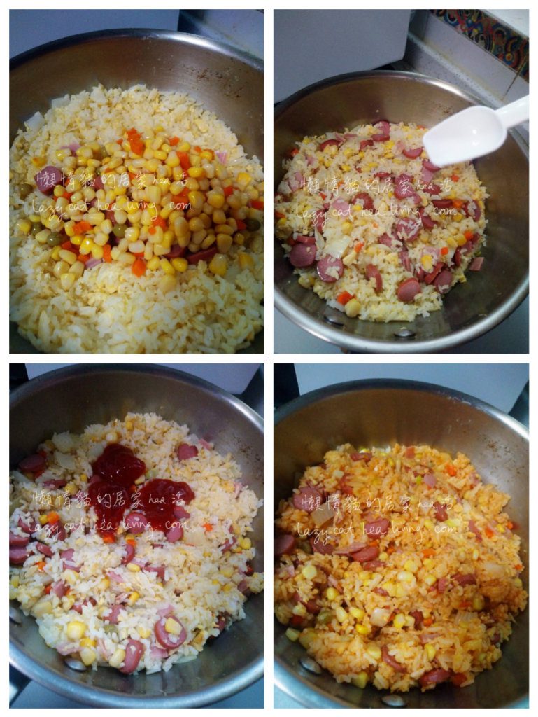 - 炒至顏色均勻以後, 嘗一嘗味道。如蕃茄醬味道不夠, 可以再加蕃茄醬, 如果太酸可以加一些糖中和。