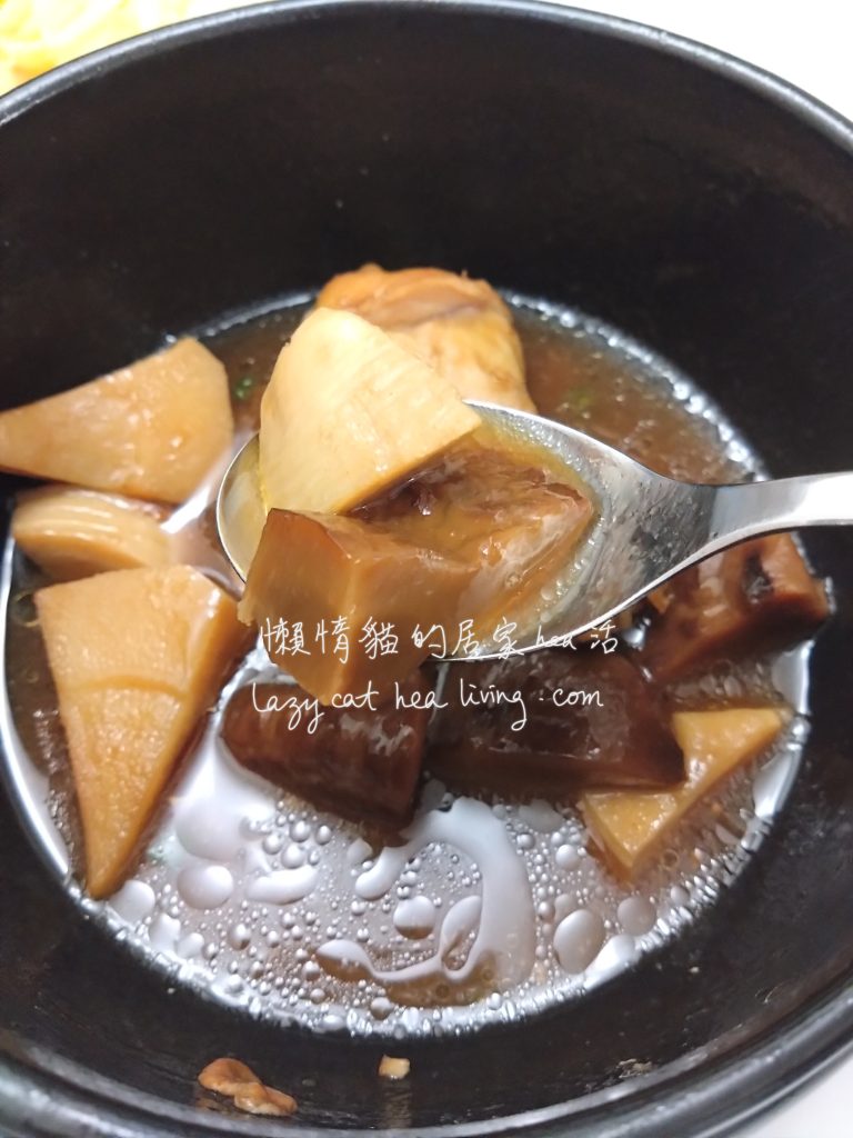 這個筍的味道, 比罐頭的那種好啊。罐頭的總是有種鹽水泡過的味道, 還是說很輕微的酸味? 就是怪怪的。急凍的筍子, 炆煮過後, 卻不會, 而且吃下去的質感, 也比罐頭的爽脆一些。