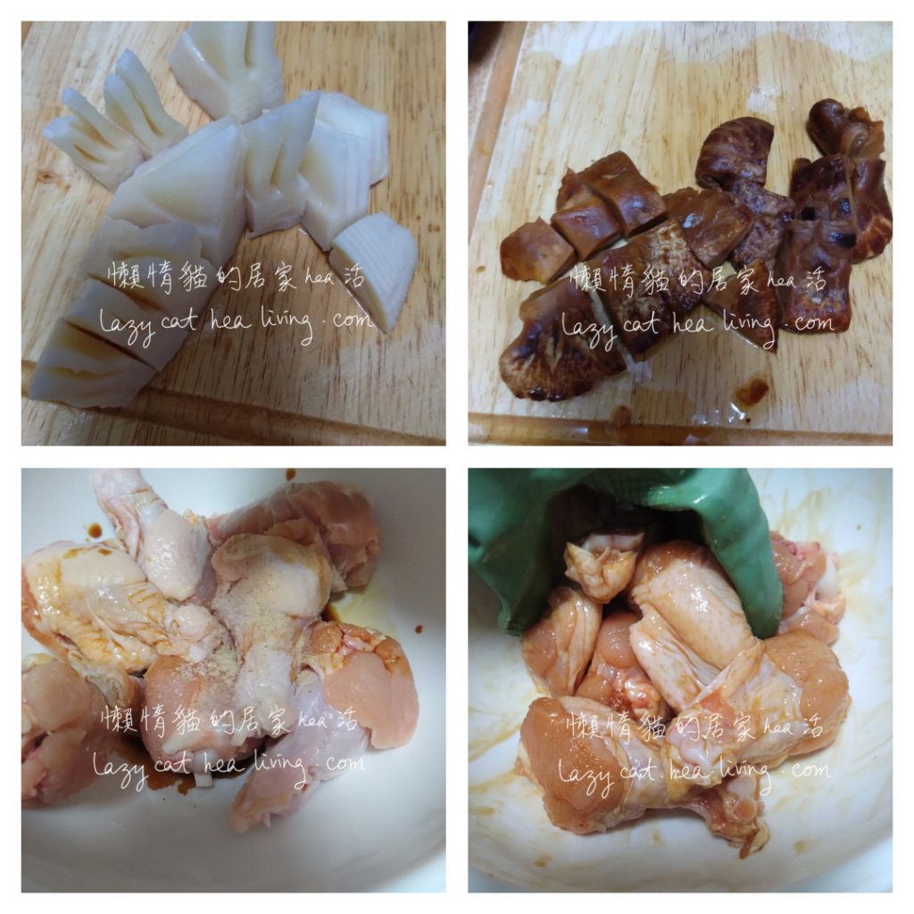 - 把泡好的冬菇去蒂, 冬筍洗淨, 然後分別切成適合的大小。薑切片。