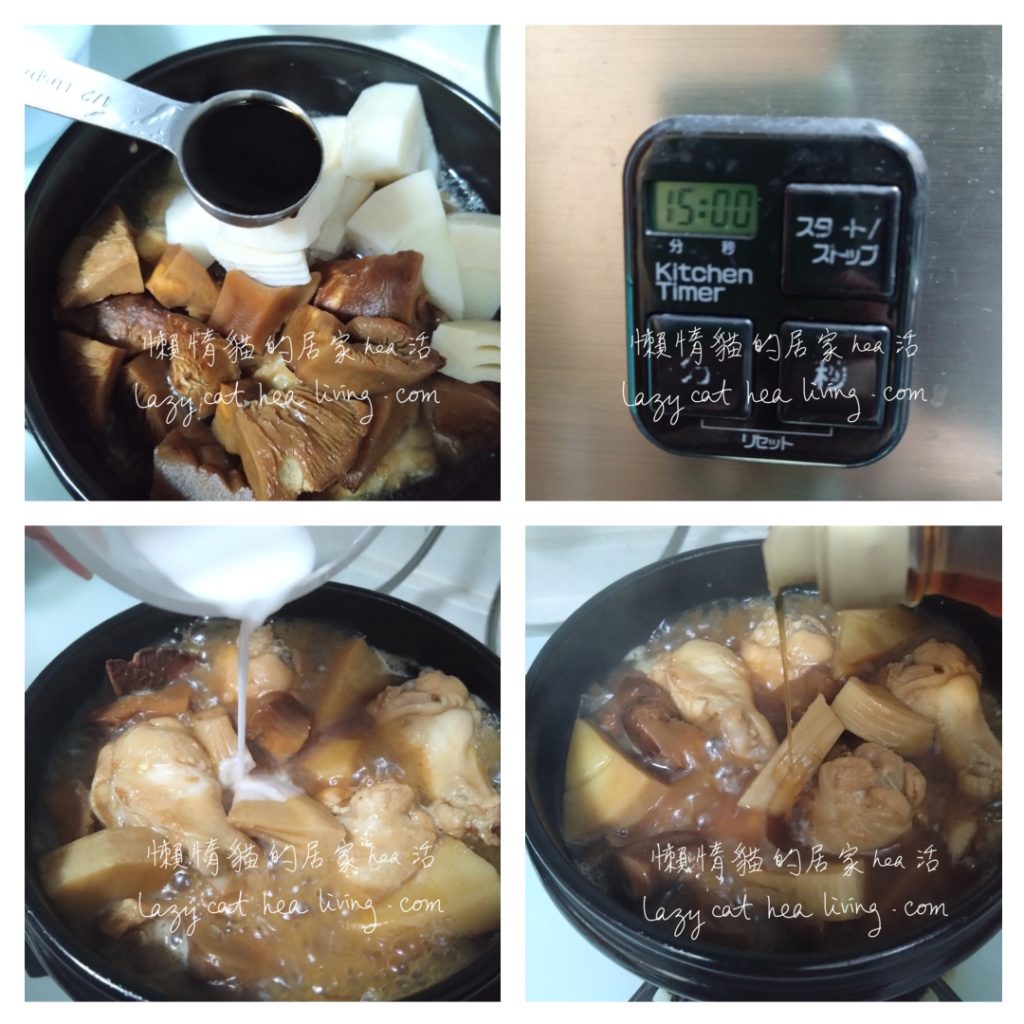 - 加入醬汁調味料 1 – 4、冬菇和冬筍, 然後加水至淹過所有食材。
