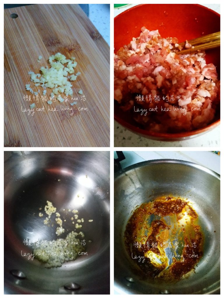 雖然材料看起來是有點多, 但是把豬肉拌一拌味道、切薑、切蒜、剪辣椒粒, 真的用不了多少時間啊。