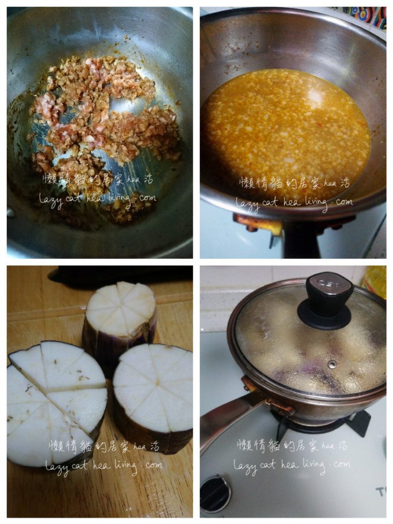 7. 等待鍋入醬汁煮滾的同時, 可以把茄子洗淨, 切去蒂頭, 然後切成粗條。一邊切, 一邊把切好的茄子放進鍋內一起煮。(這樣可以避免茄子一早切好會氧化變黑, 又可以省時間。)