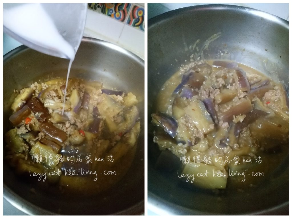 8. 把茄子跟醬汁炒勻, 醬汁應該可以浸到茄子的最少 2/3 高度, 不夠水可以加水。