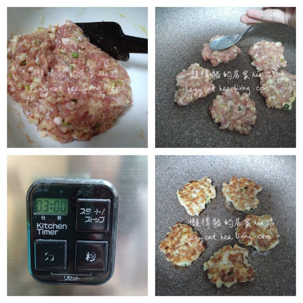 - 準備一支煎鍋, 下適量的油, 開中火, 把步驟 4 的豬肉, 以湯匙勺出一顆顆肉丸下鍋, 再以湯匙背面壓成肉餅形狀。(為確保豬肉煎熟, 肉餅厚度約 1 cm 左右為佳。)