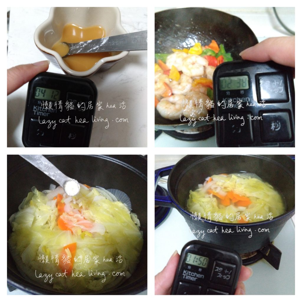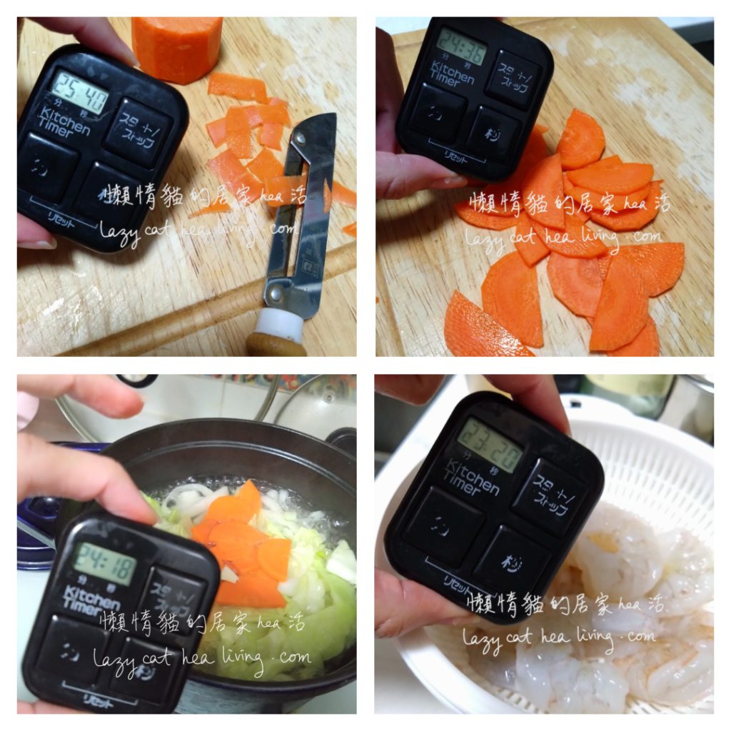 - [倒數時間 23:20] 蓋上湯鍋鍋蓋。蝦子沖洗以後瀝水。