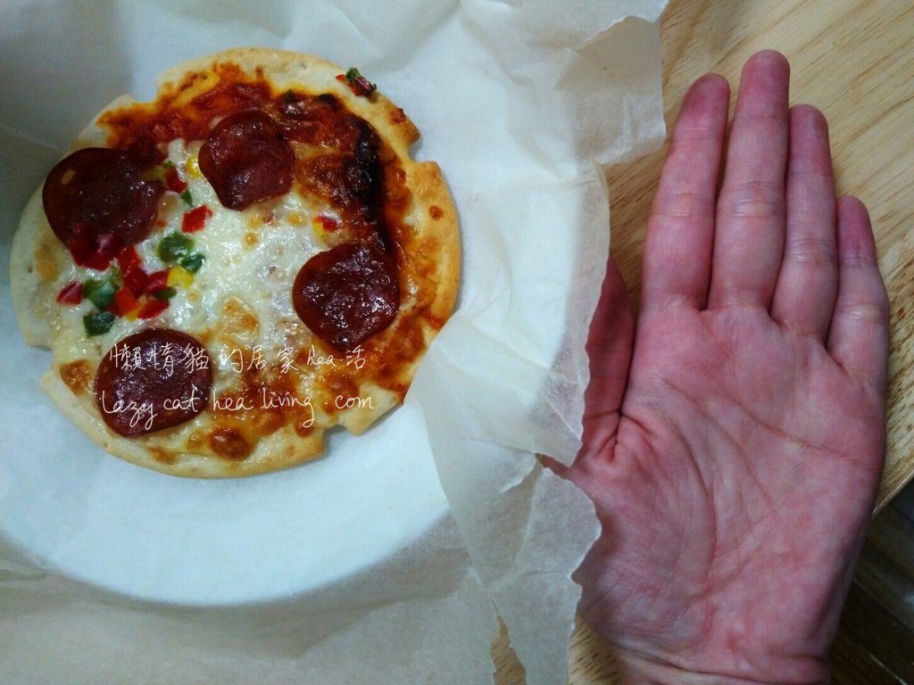 看到嗎? 有四片肉腸, 也有一些彩椒碎。它真的很小, 跟我手掌比比看。